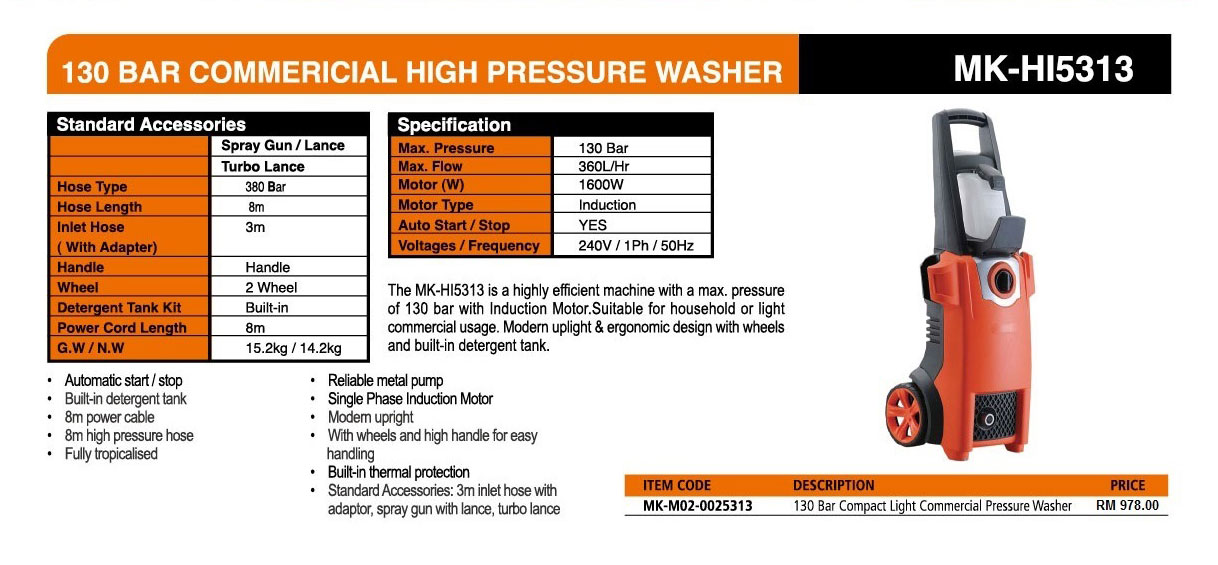 130 BAR COMMERCIAL HIGH PRESSURE WASHER